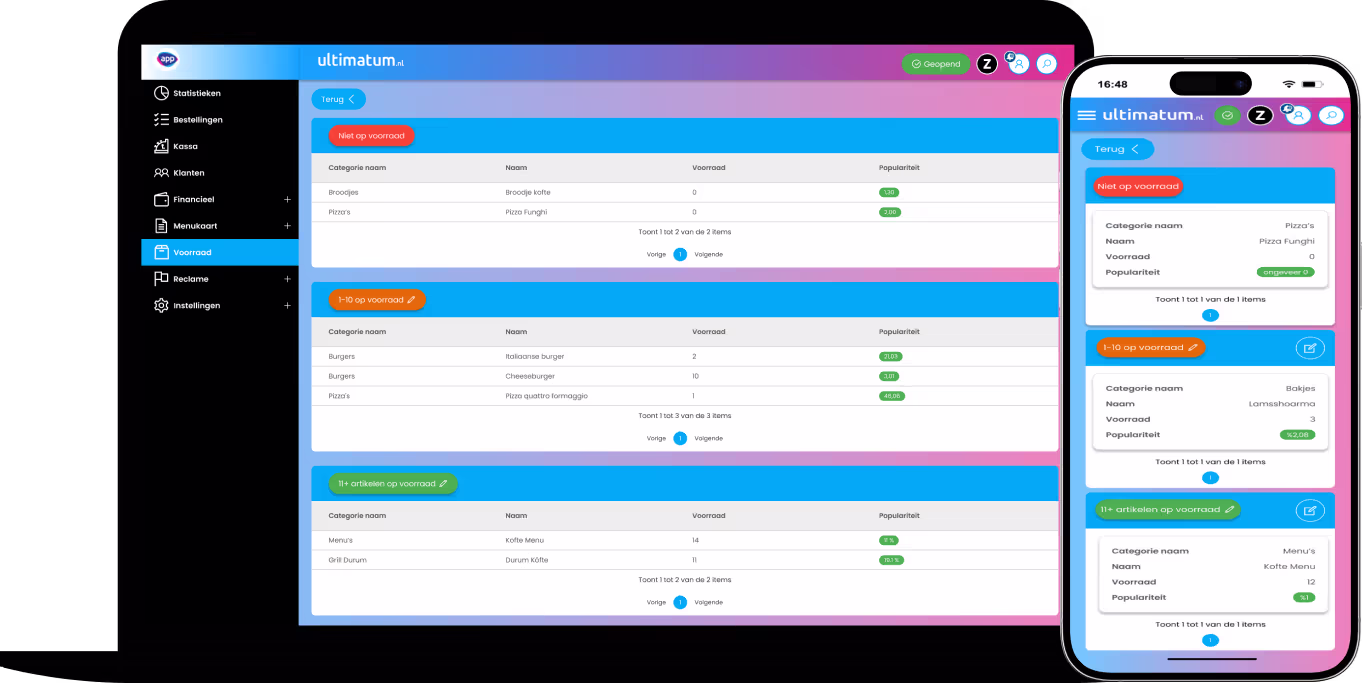 En dankzij slimme notificaties weet je precies wanneer het tijd is om actie te ondernemen. Het beste is dat dit allemaal naadloos integreert met je bestelproces. Dus als een bepaald gerecht niet meer beschikbaar is, wordt dit automatisch bijgewerkt in je online menu. Kortom, met ons voorraadbeheersysteem houd je de touwtjes stevig in handen, zonder dat het je veel tijd kost. Een win-win voor jou en je klanten.